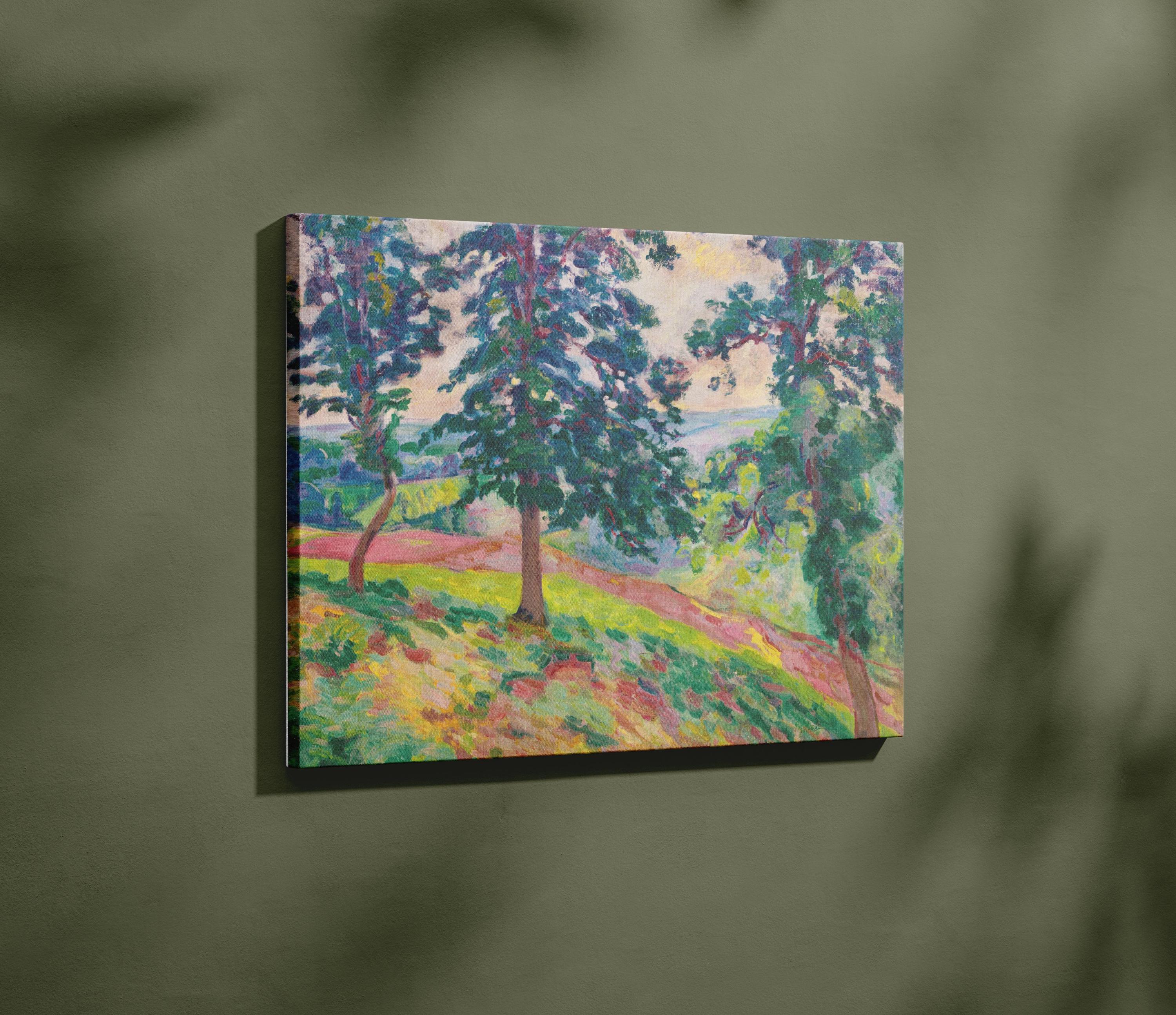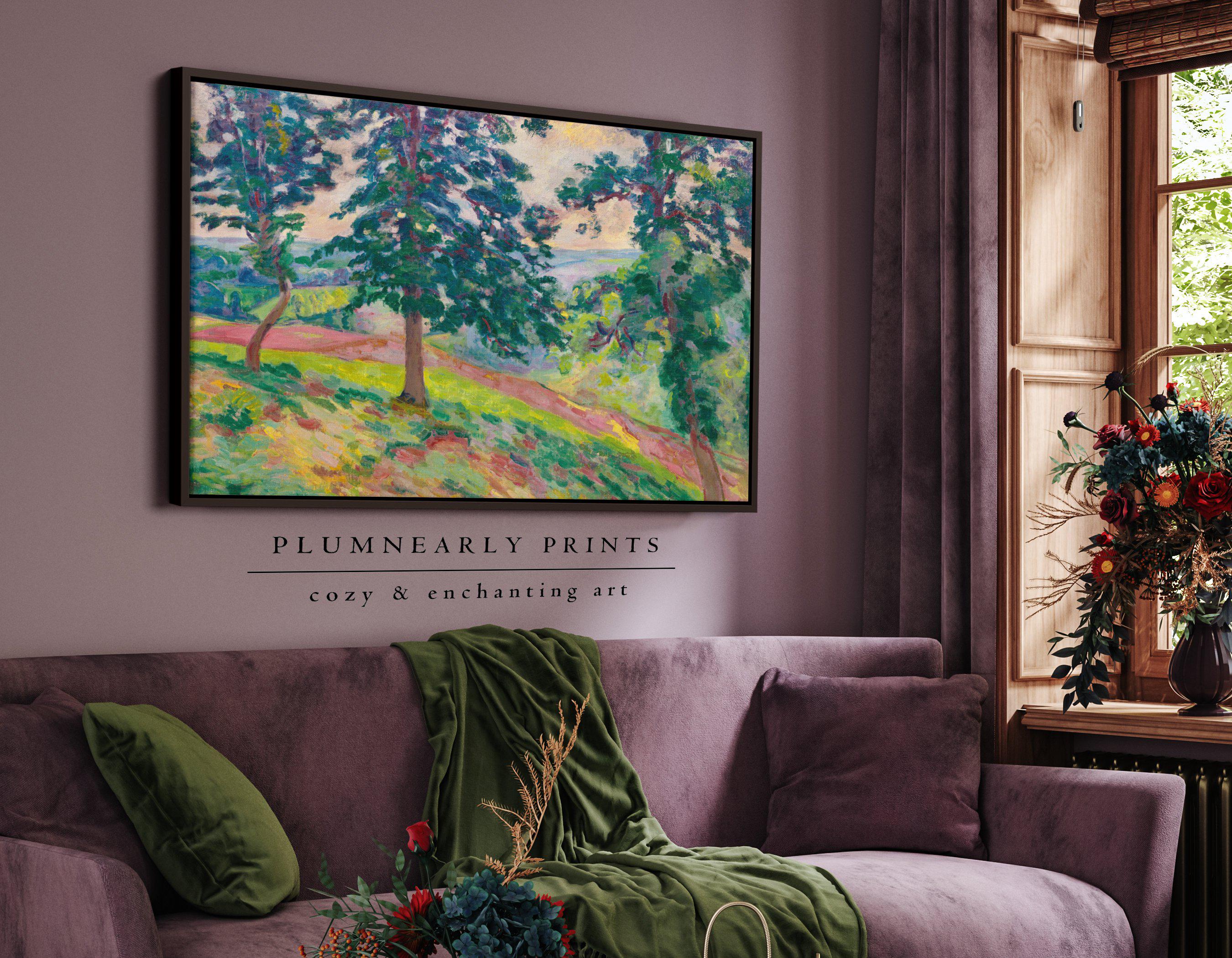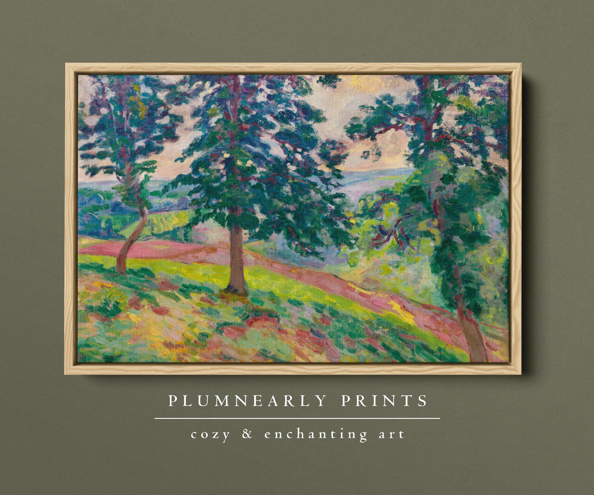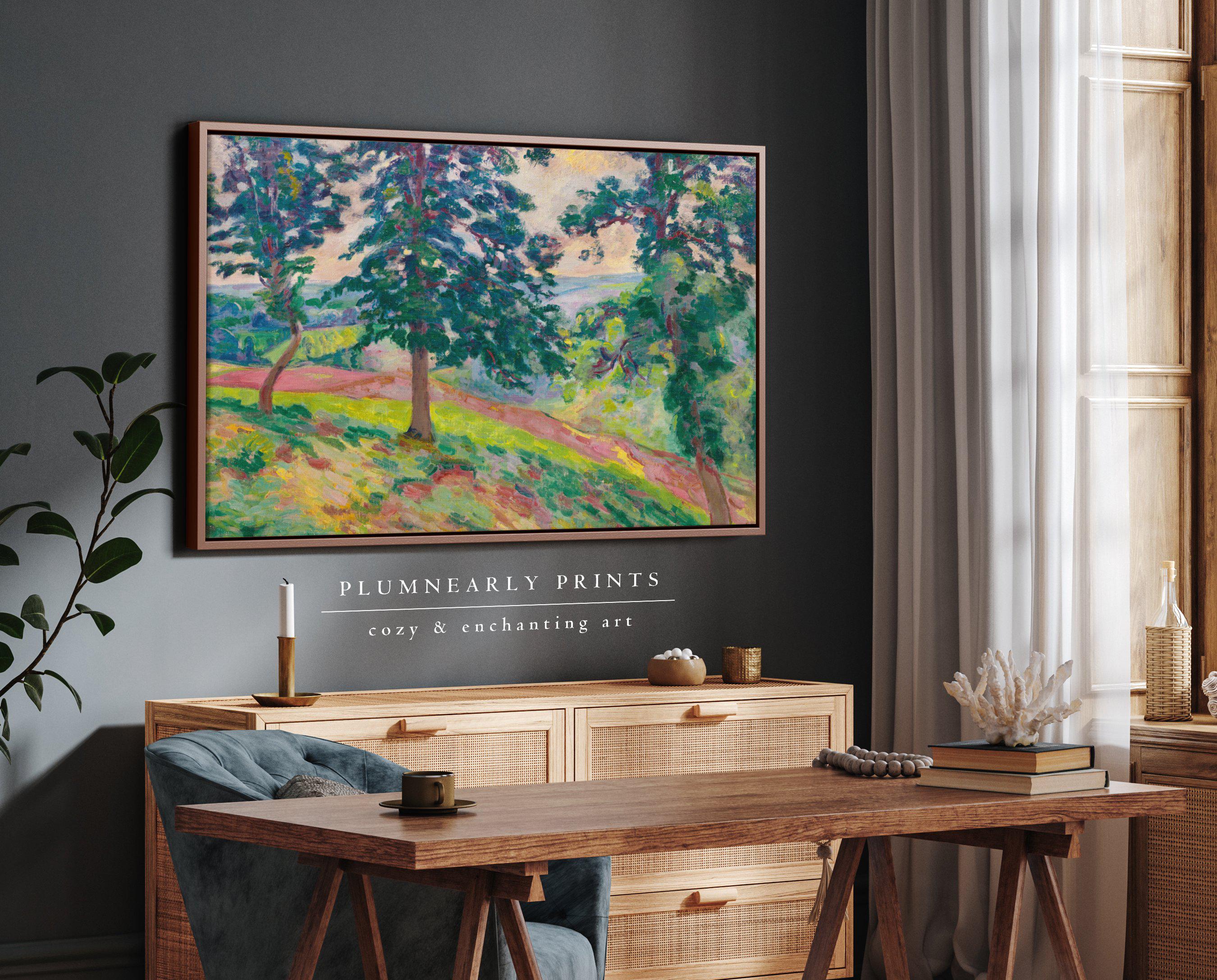 Guillaumin Scenic Forest Overlook Framed Canvas, Vintage Impressionist Tree Landscape Painting, Maximalist Chartreuse Green Yellow Decor