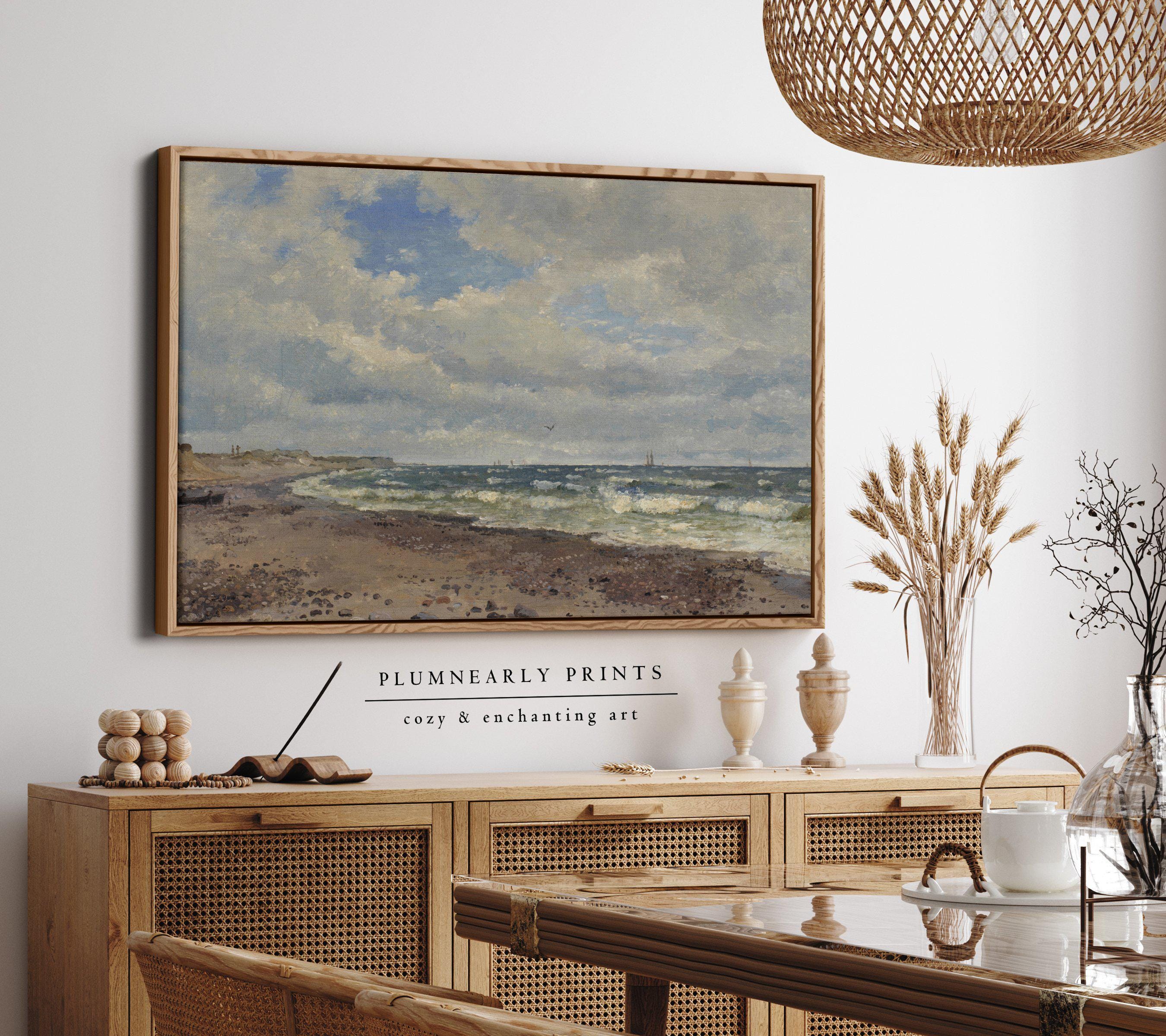 Dreyer Beach Landscape Framed Canvas, Vintage Seascape Oil Painting, Neutral Beige Buttercream Aquamarine Ocean Sea Blue Wall Decor