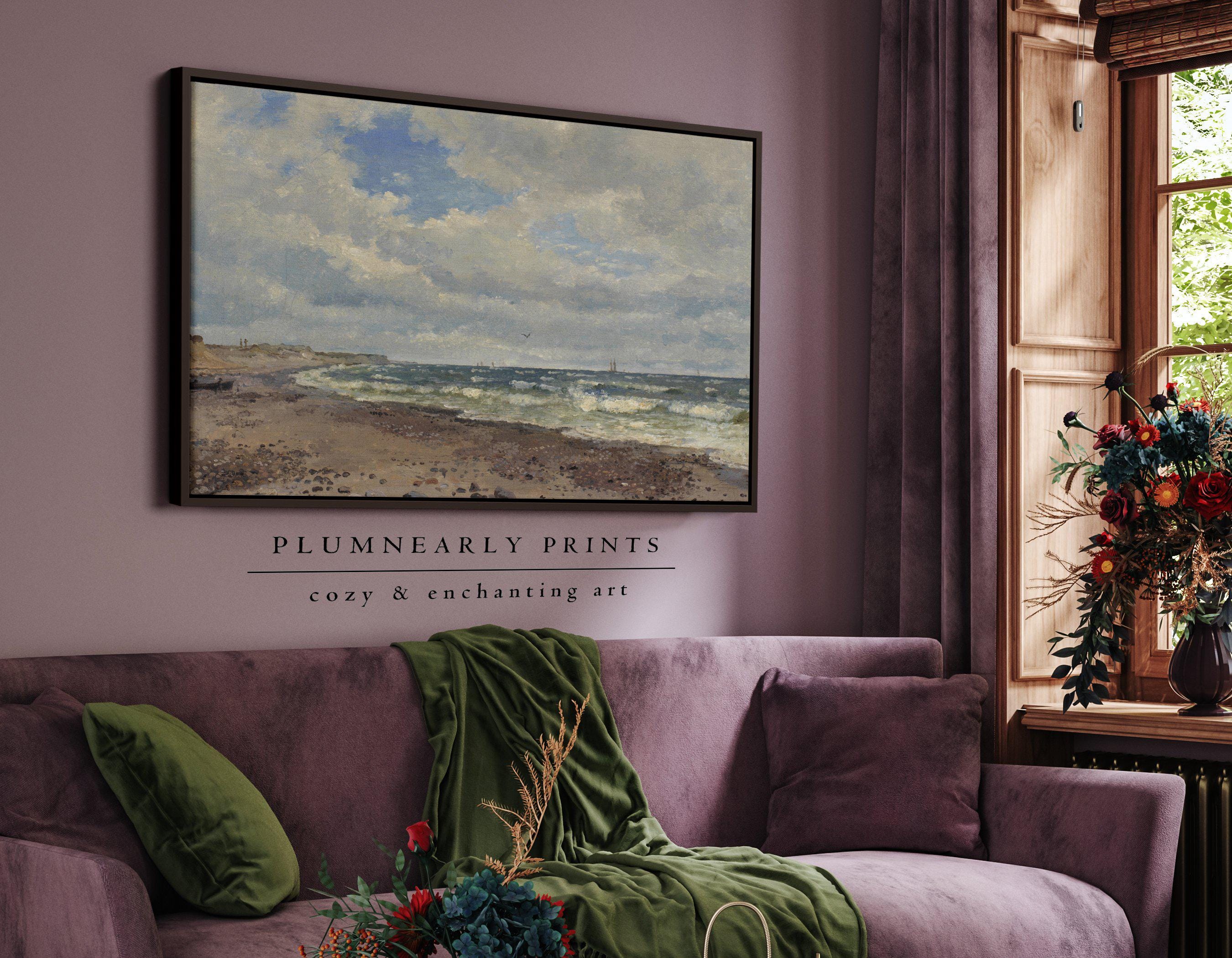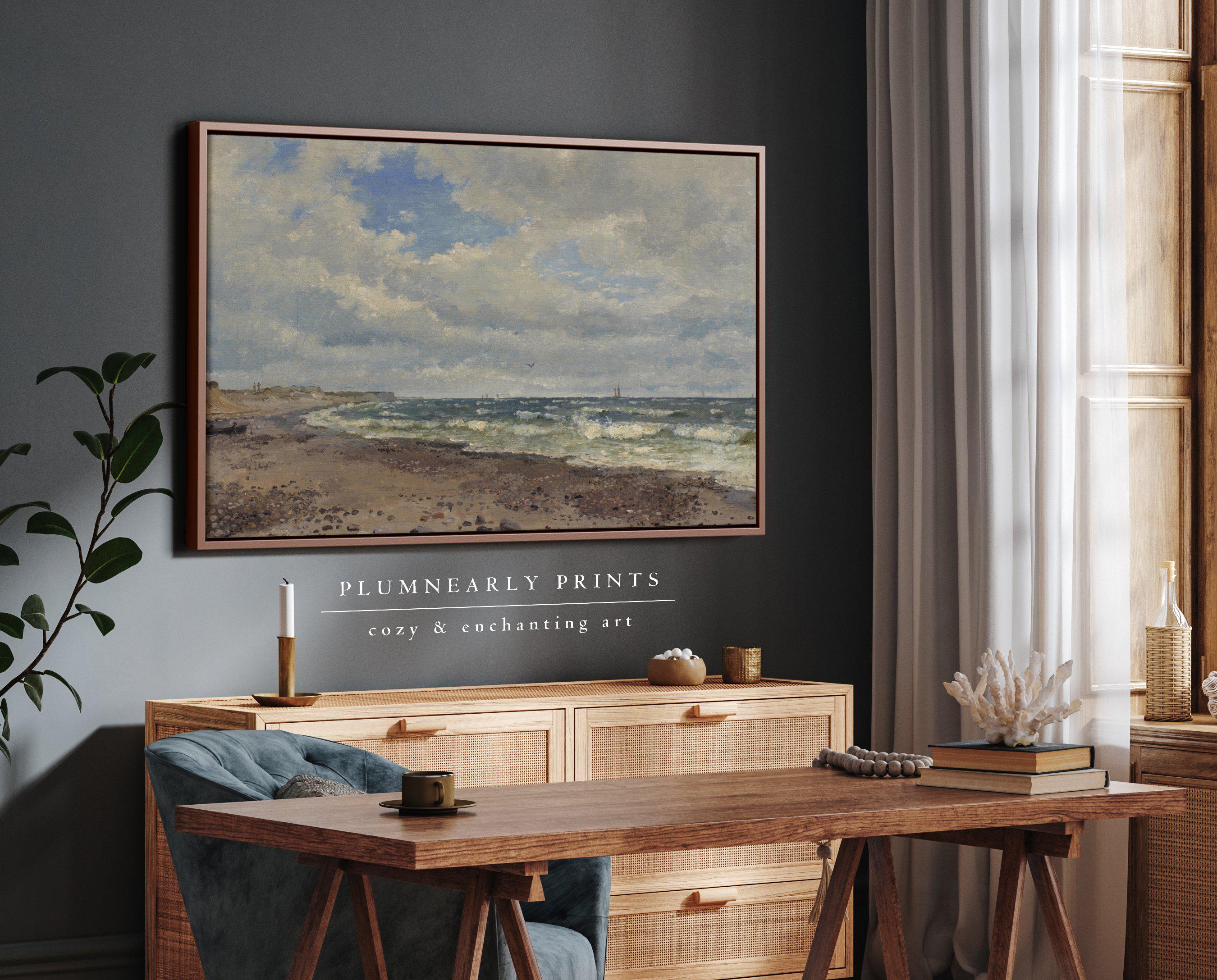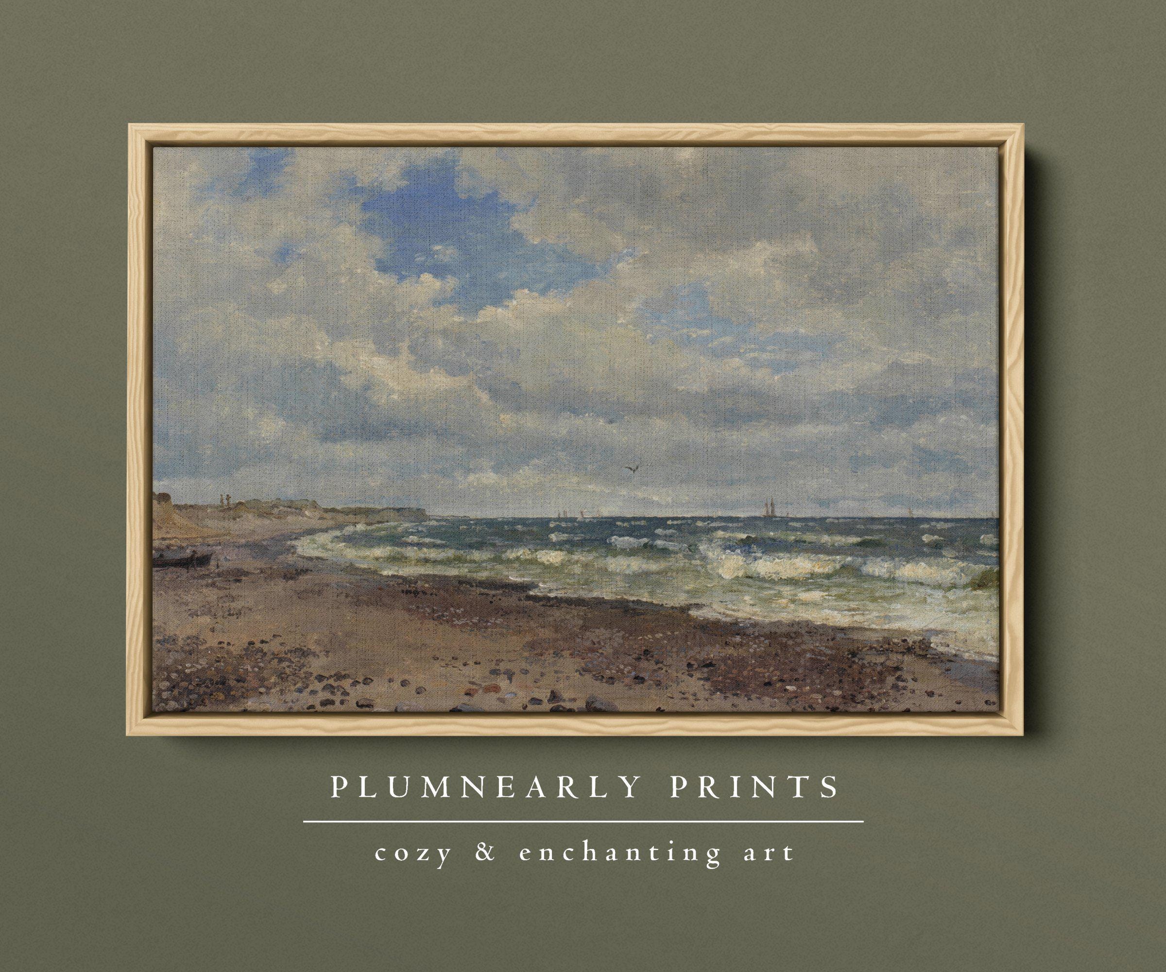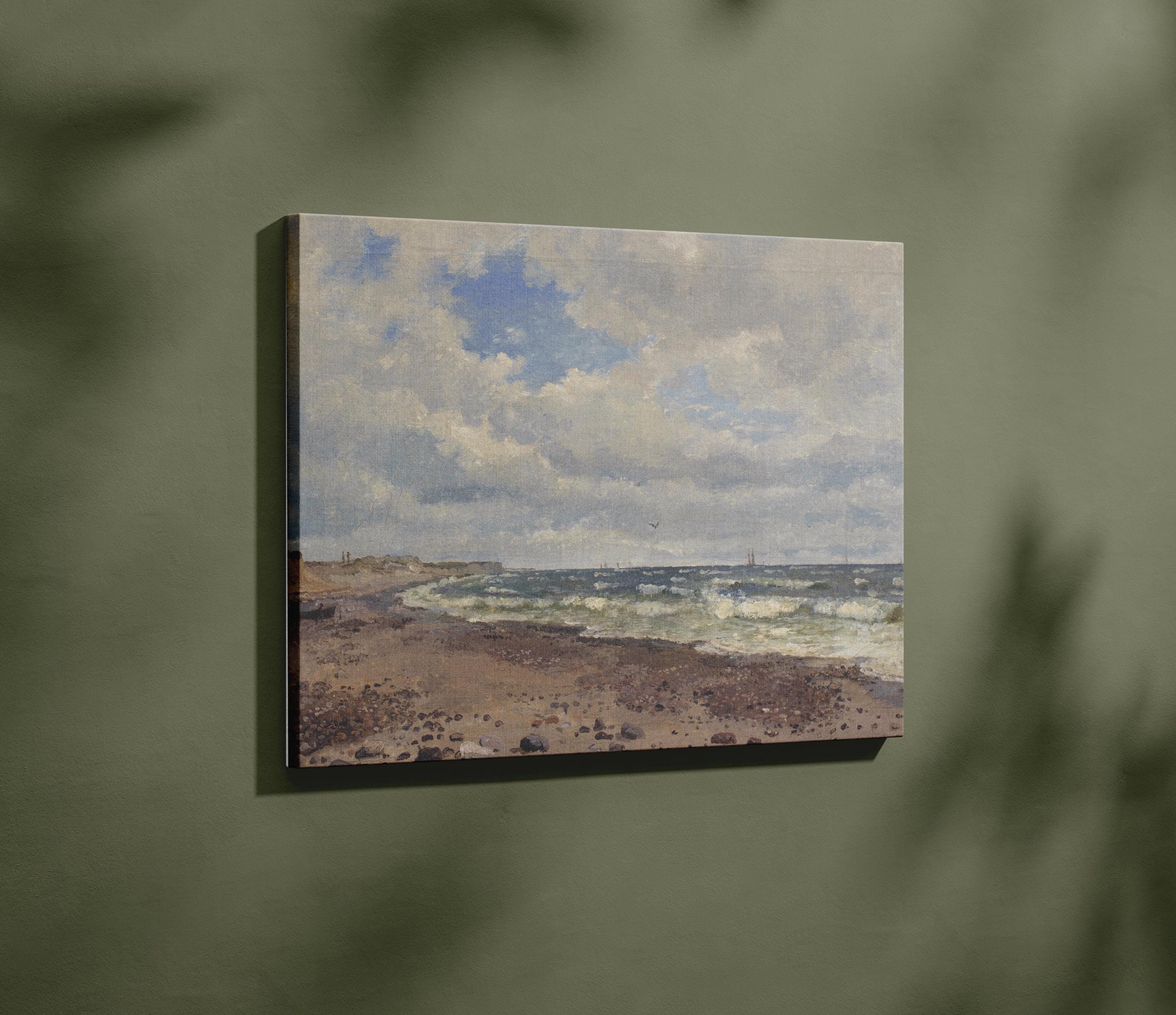 Add a touch of vintage charm to your home with this beautiful landscape oil painting by 19th century Danish artist Dankart Dreyer. This antique seascape captures the serene beauty of the coastline with neutral beige and sage green tones, perfect for rustic farmhouse and romantic cottagecore decor. Ideal for creating a nostalgic and peaceful atmosphere in any room.