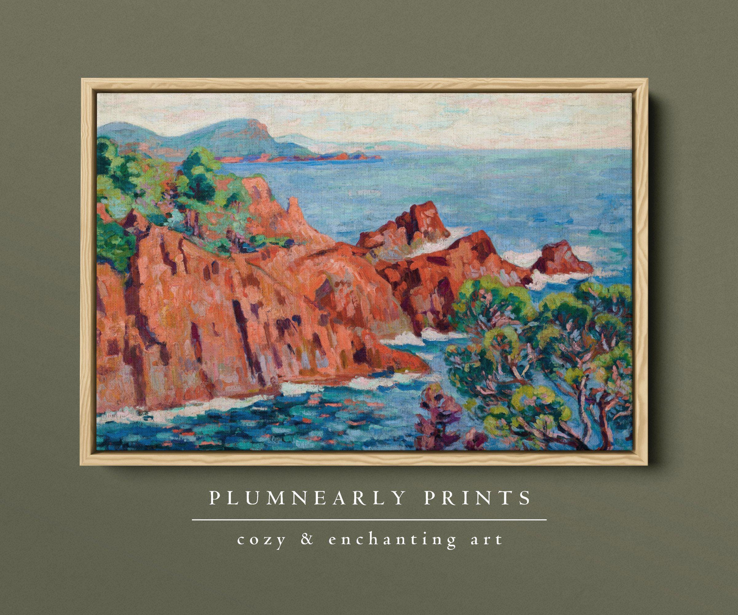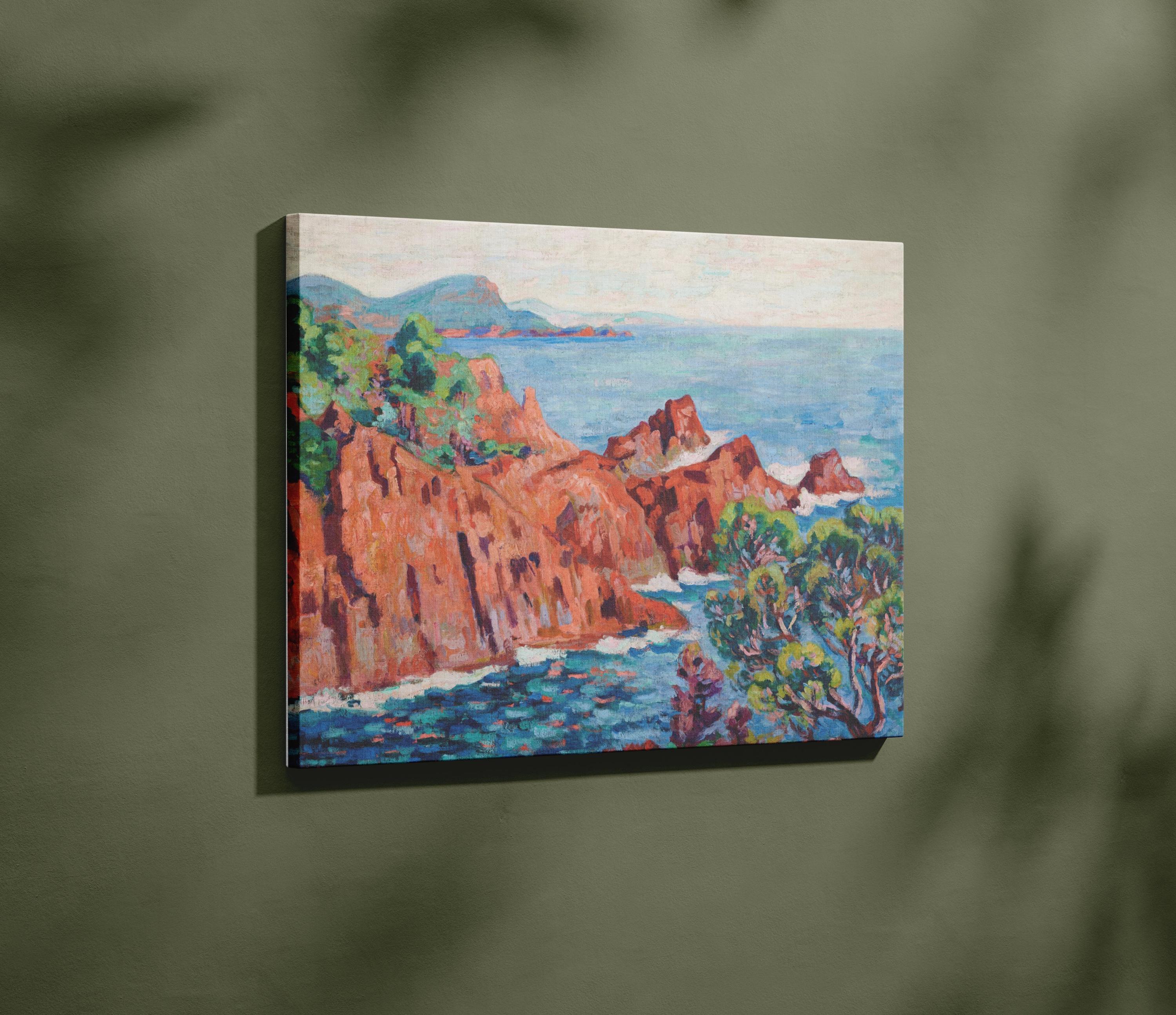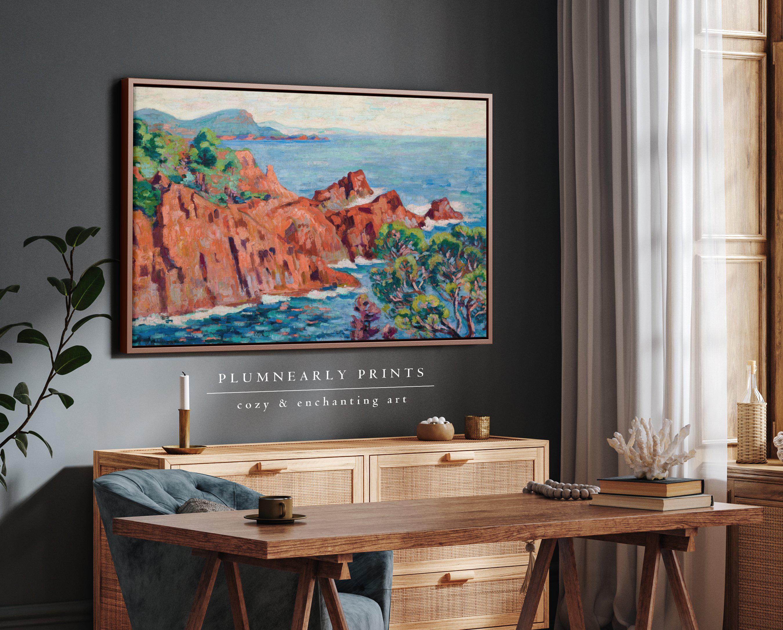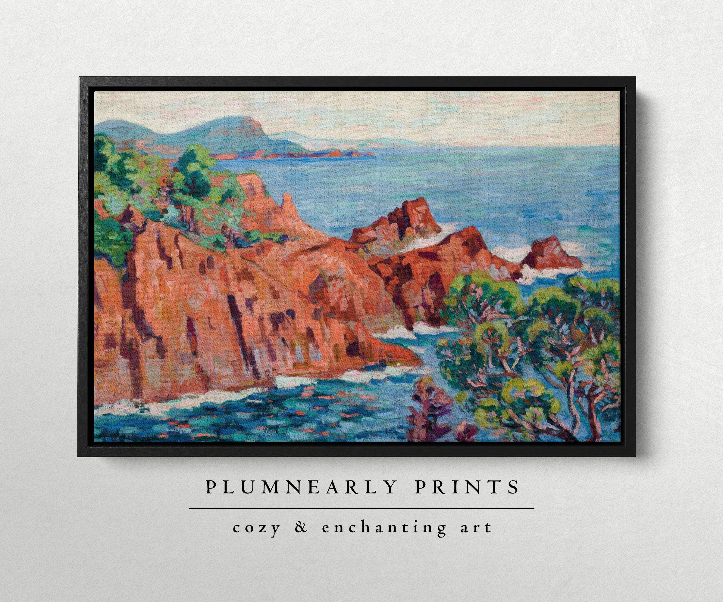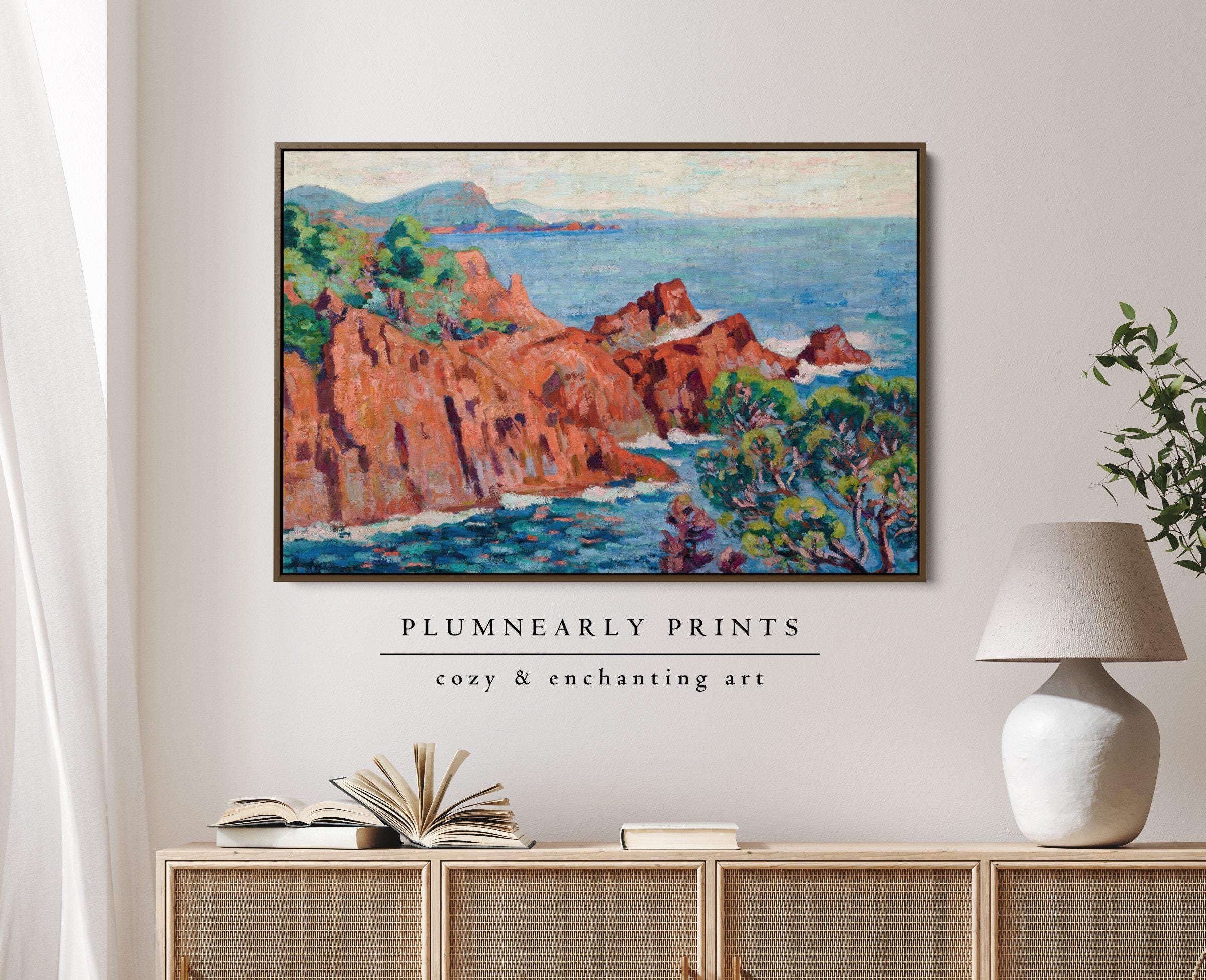 Guillaumin Fauvist Seaside Cliff Landscape Framed Canvas, Colorful Nautical Teal Aquamarine Blue Green Cinnamon Orange Beach House Decor