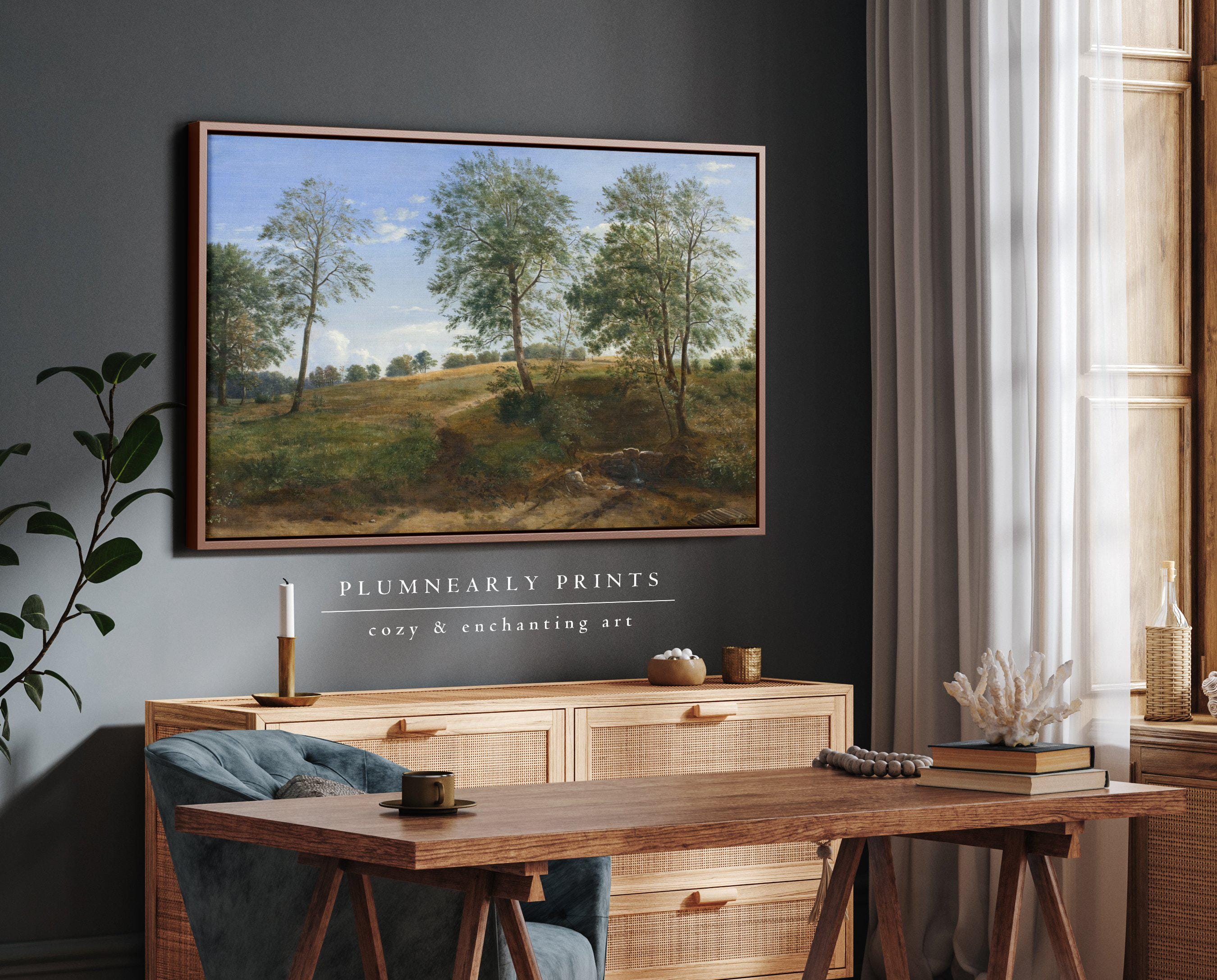 Dreyer Countryside with Trees Framed Canvas, Vintage Forest Landscape Oil Painting, Sage Green Periwinkle Blue Mustard Yellow Wall Decor