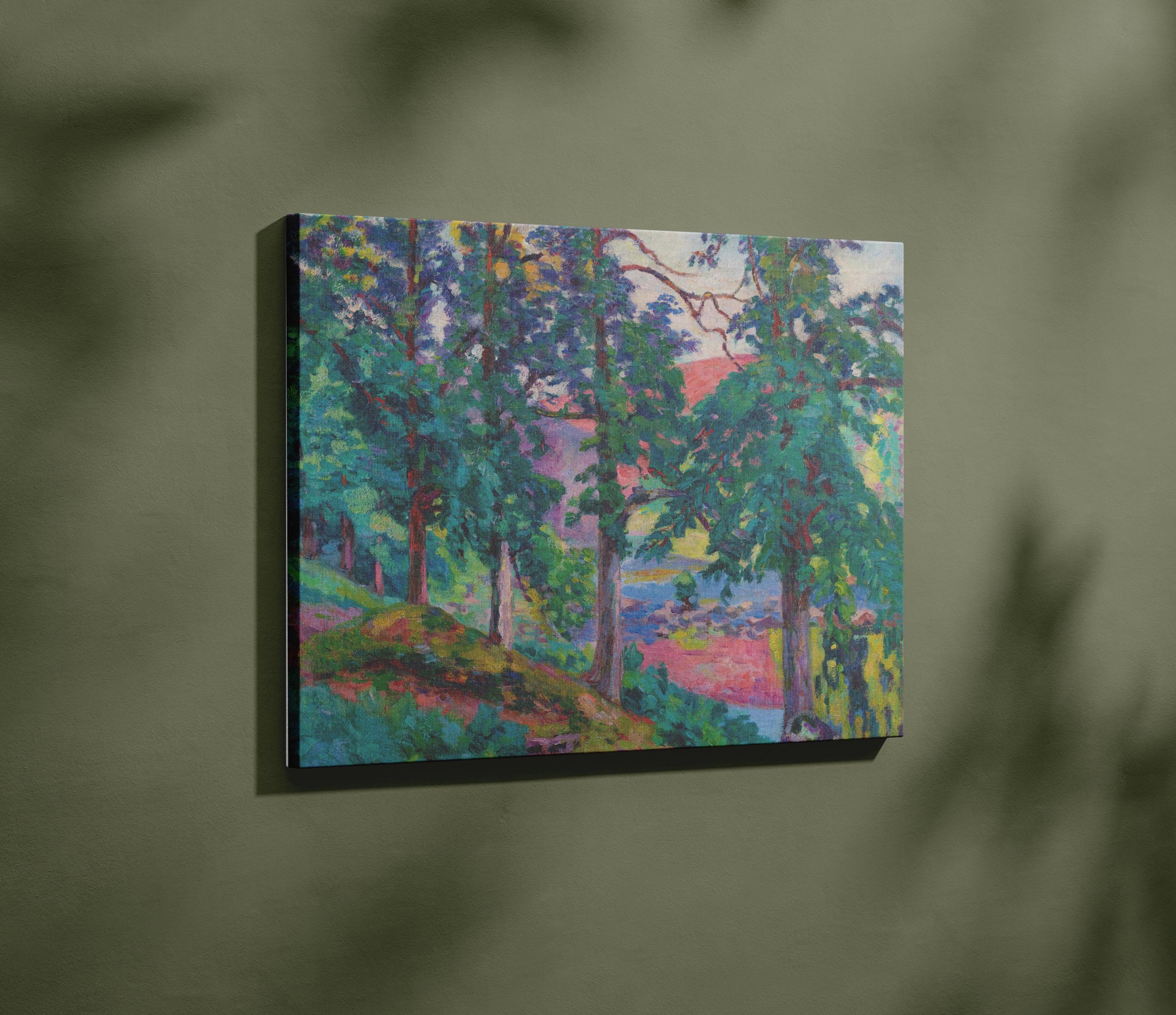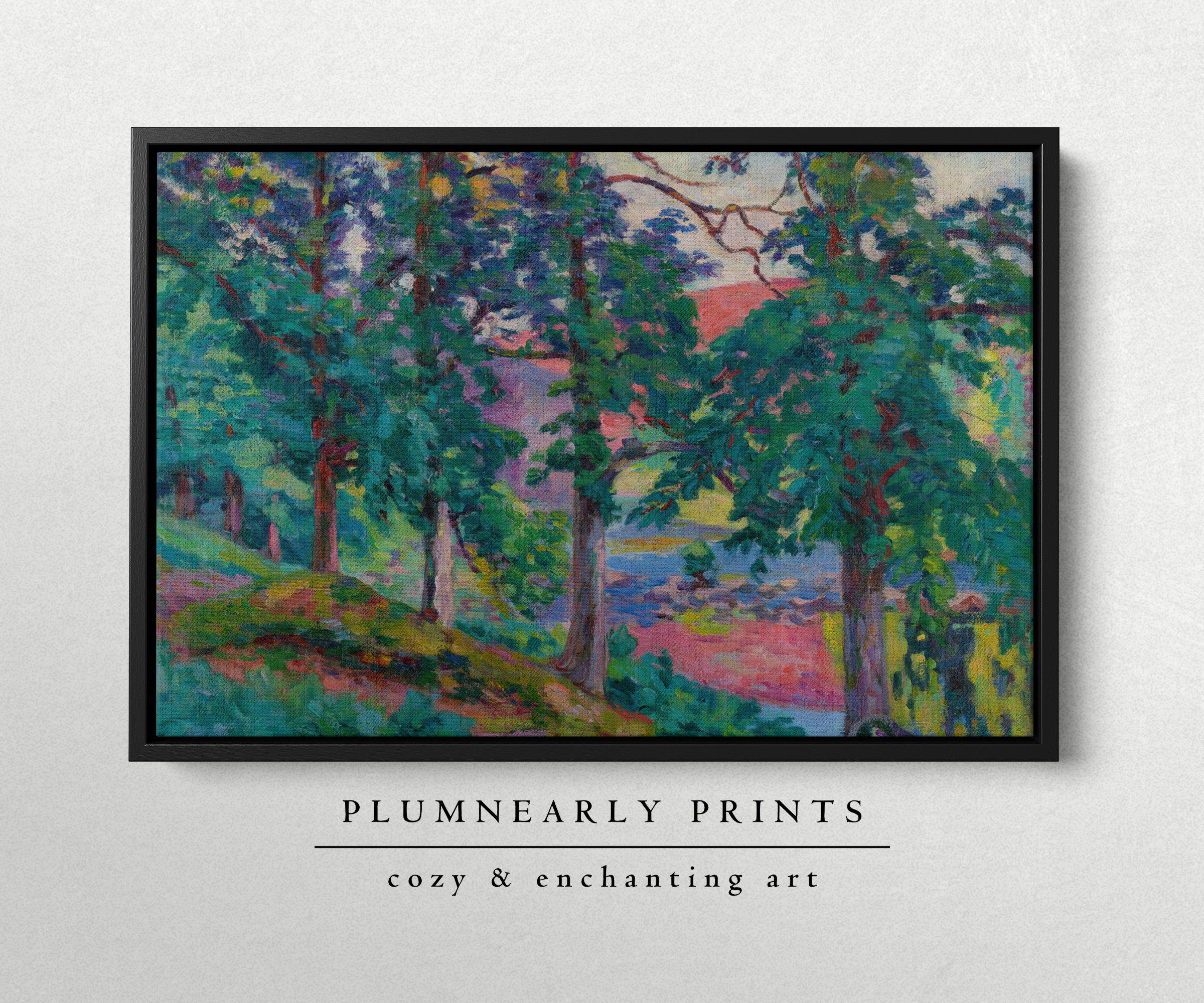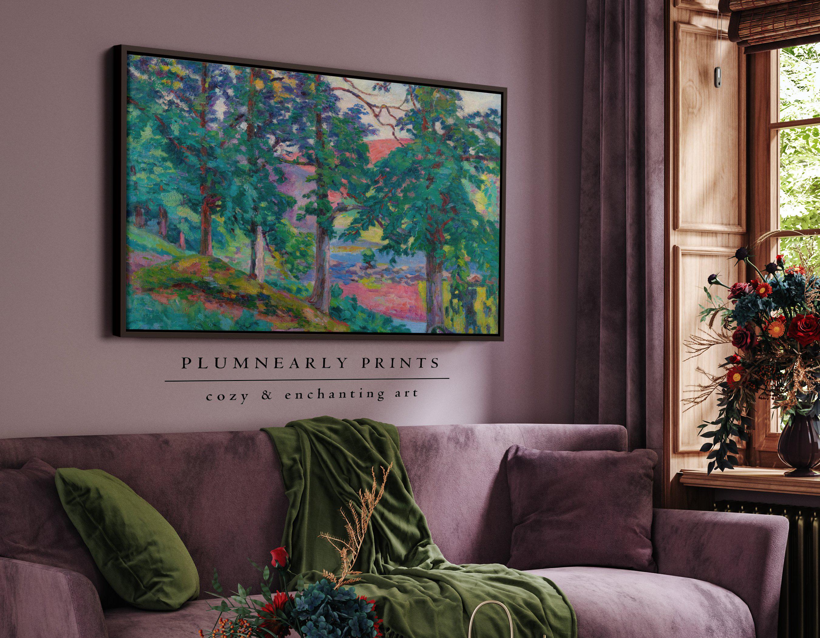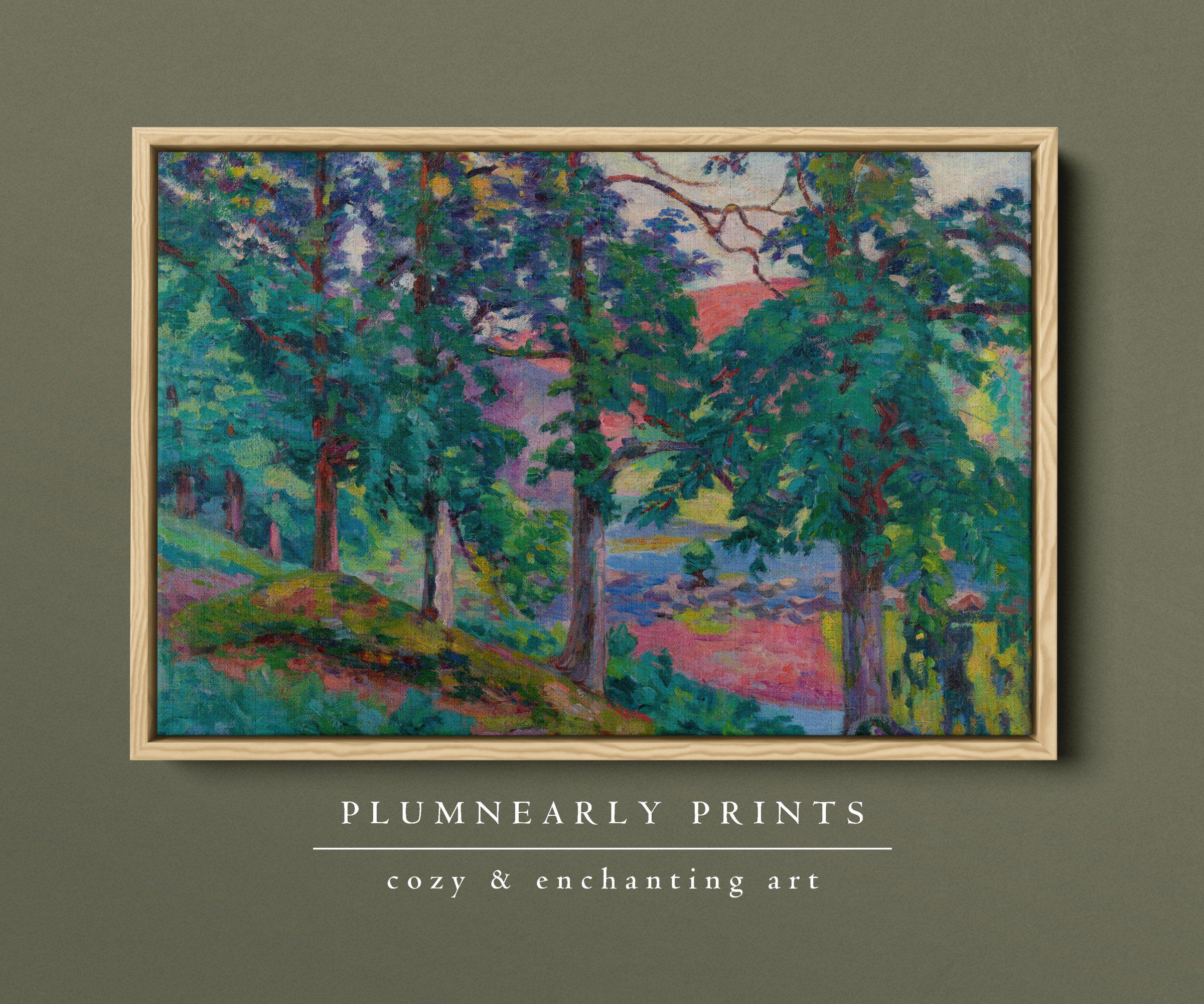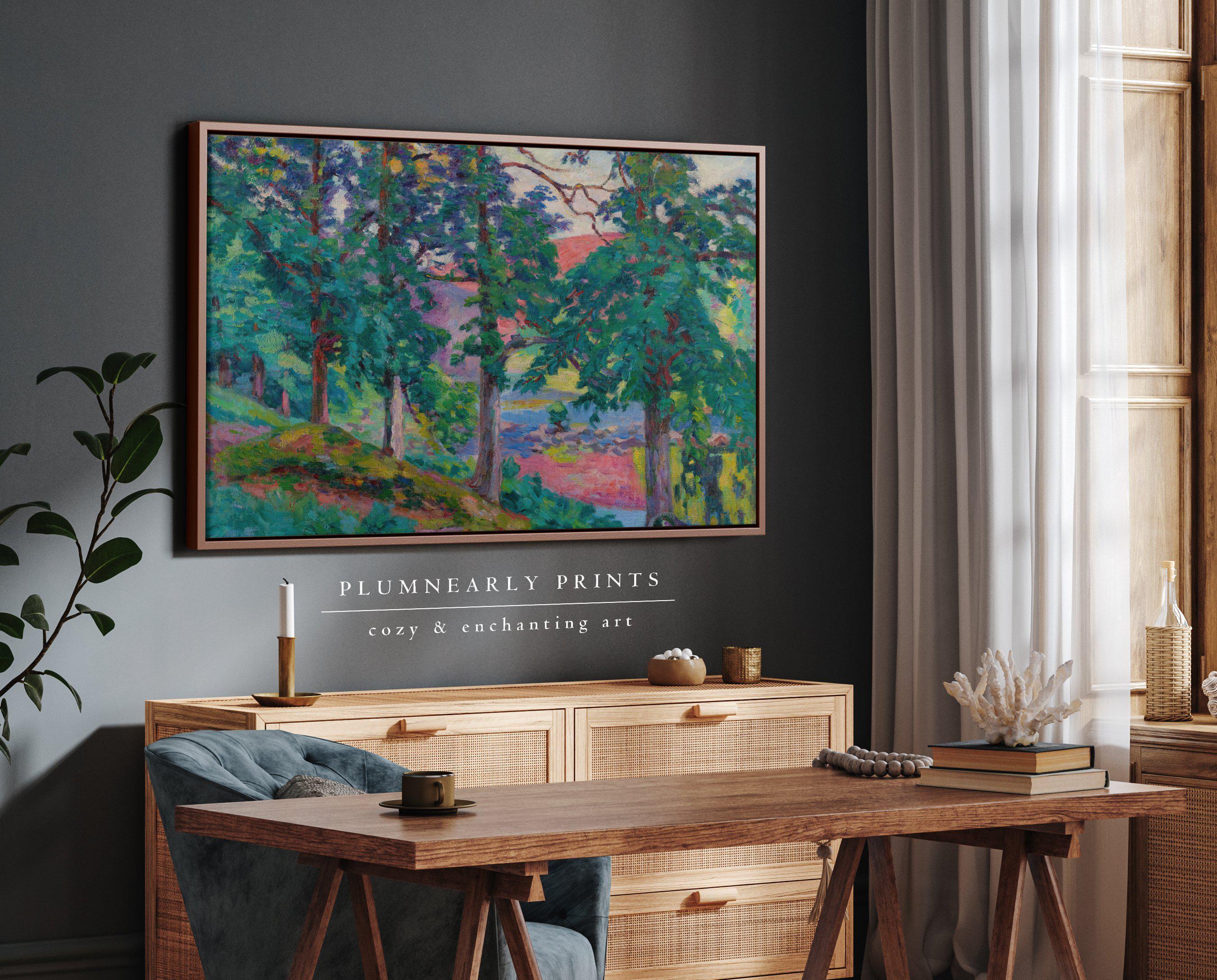Guillaumin Colorful Forest Painting Landscape Framed Canvas, Maximalist Chartreuse Jungle Green Pink Periwinkle Lavender Purple Decor