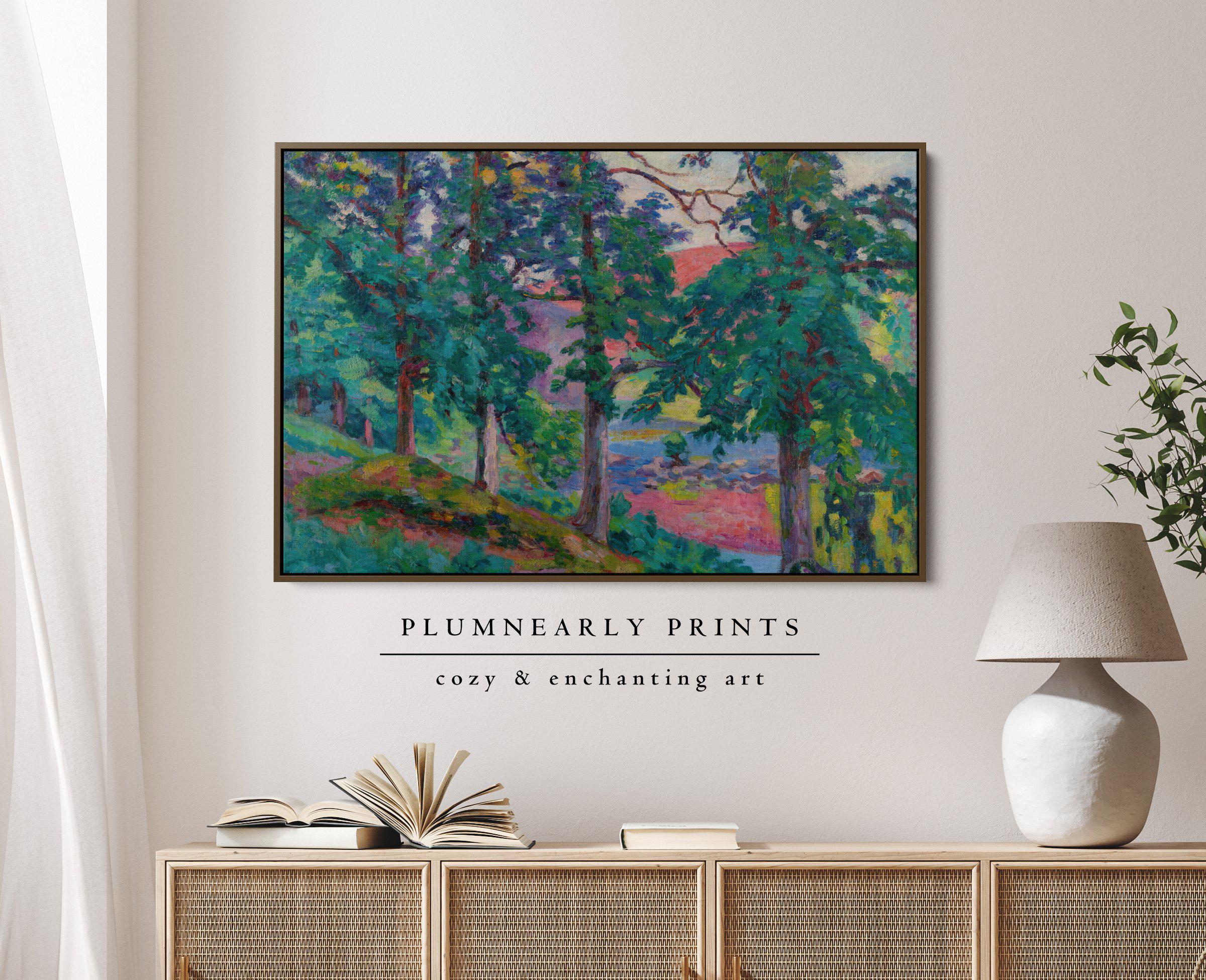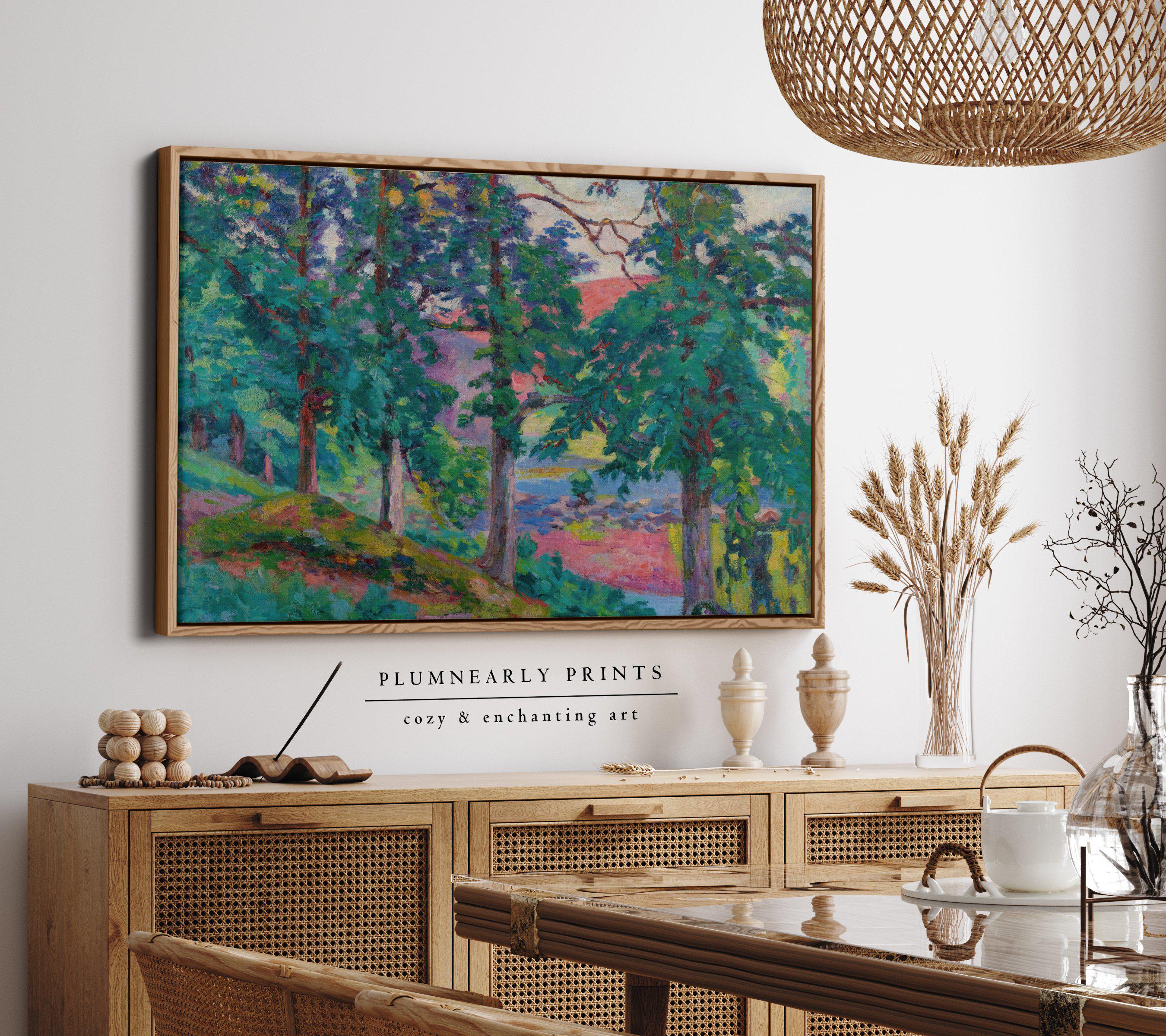 Add a touch of bold and vibrant color to your space with this vintage French impressionist landscape wall art by Armand Guillaumin. Perfect for creating a romantic yet modern statement in any room, this colorful and maximalist artwork captures the beauty of nature and the charm of French country decor.