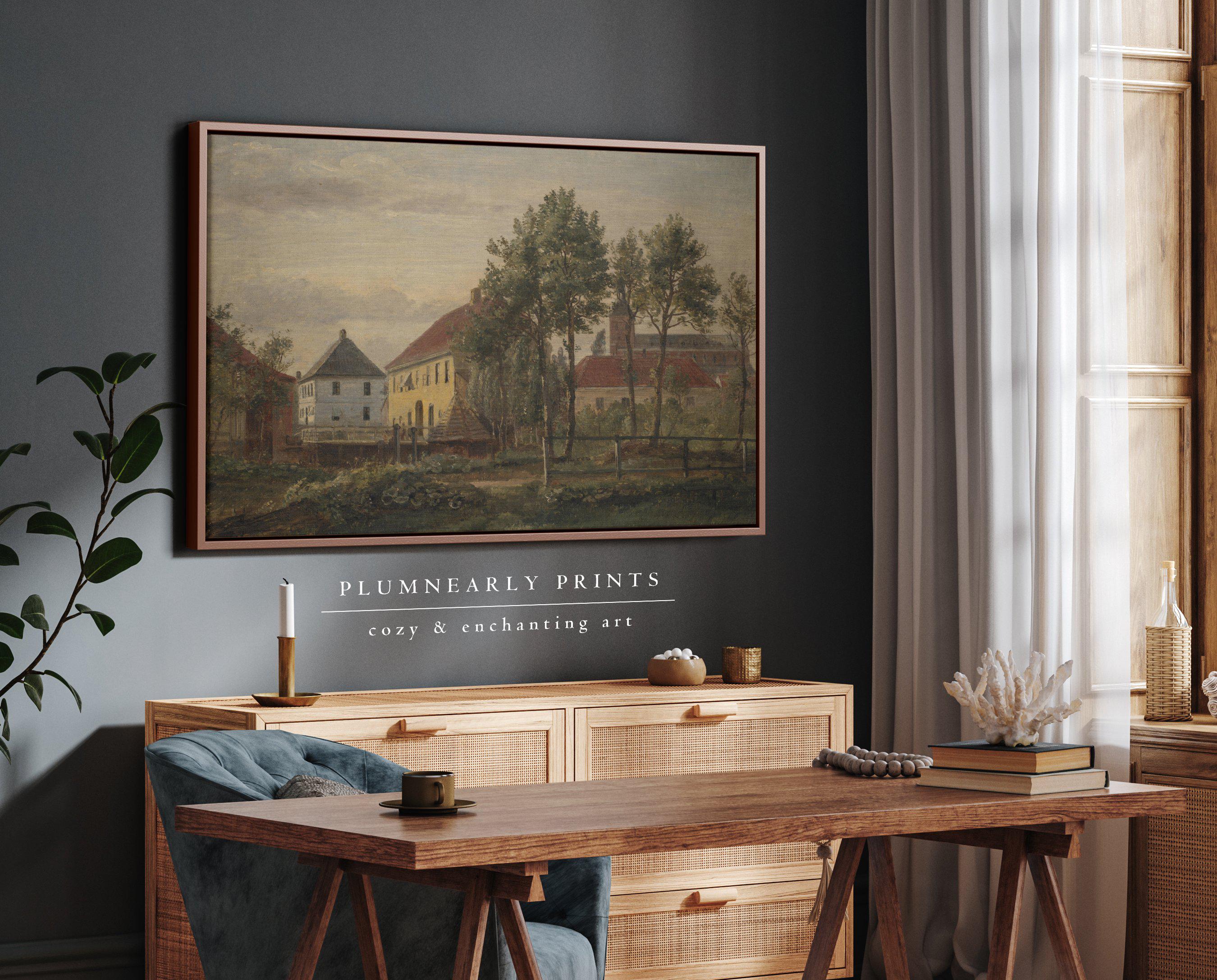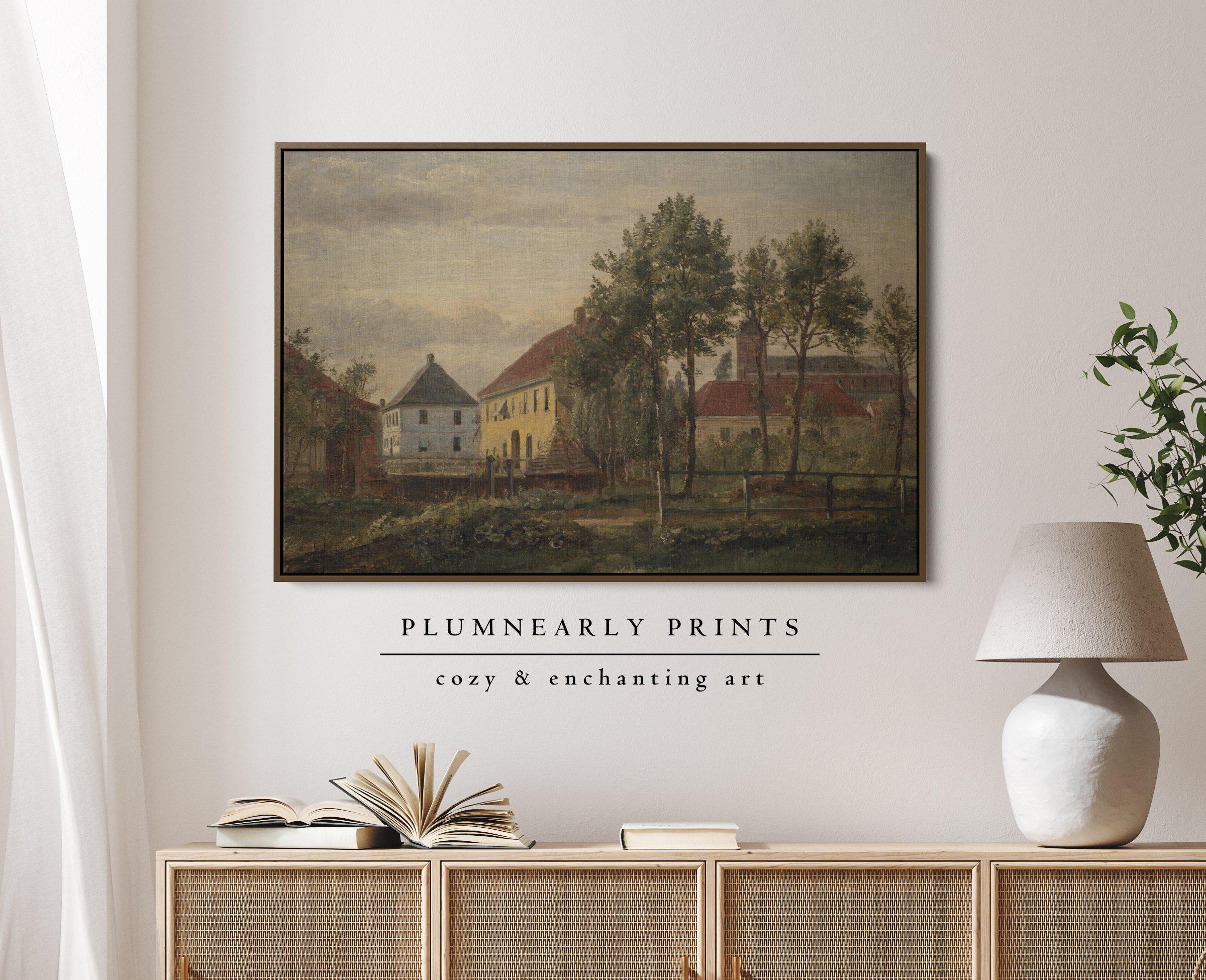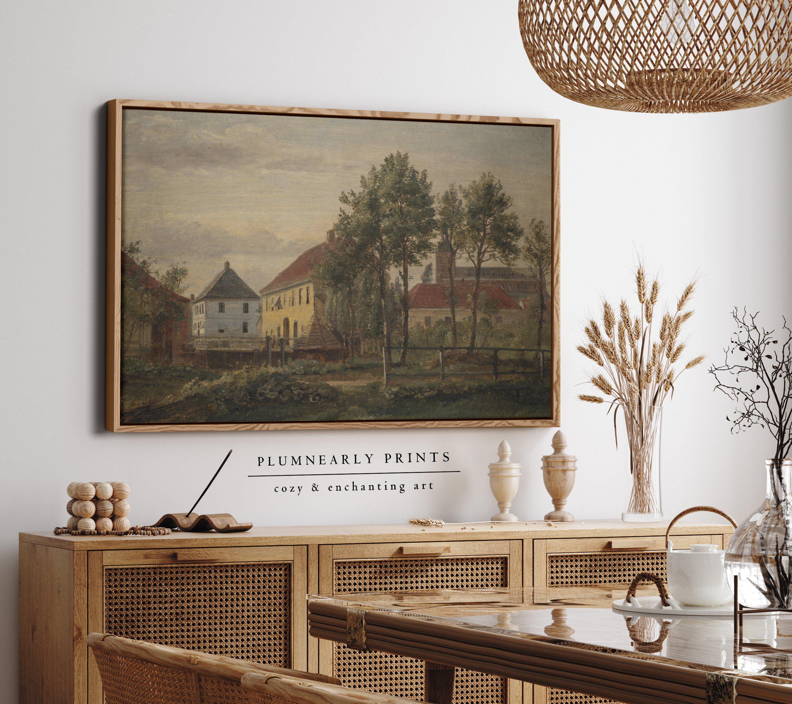 Discover the timeless beauty of this vintage antique landscape oil painting by 19th-century Danish artist Dankart Dreyer. Perfect for adding a touch of elegance to your home decor, this wall art piece captures a serene English countryside scene, featuring charming rustic farmhouse and romantic nature elements. The neutral tones of beige and sage green bring a calming ambiance, making it ideal for cottagecore enthusiasts and those seeking a French country aesthetic in their living space.