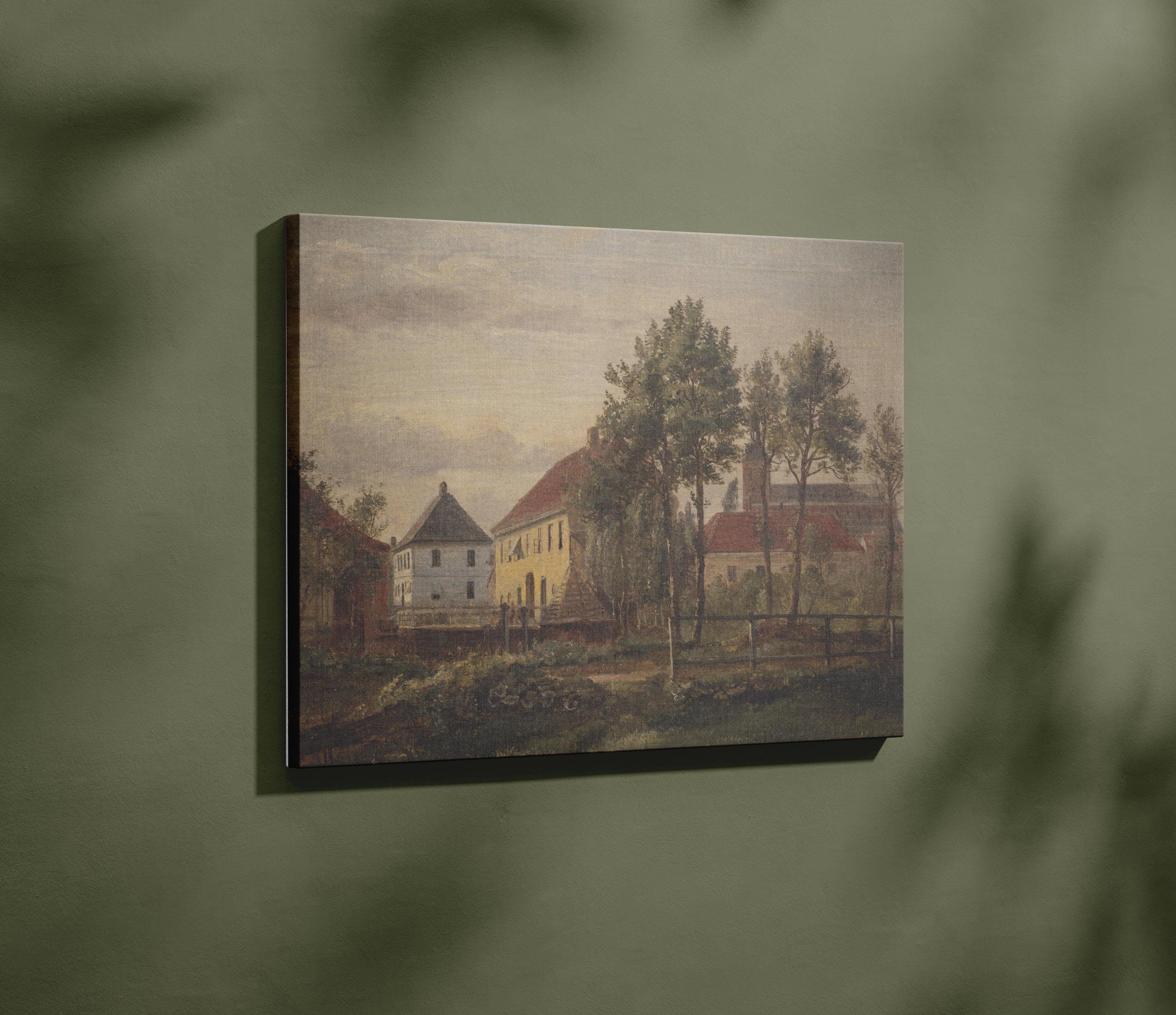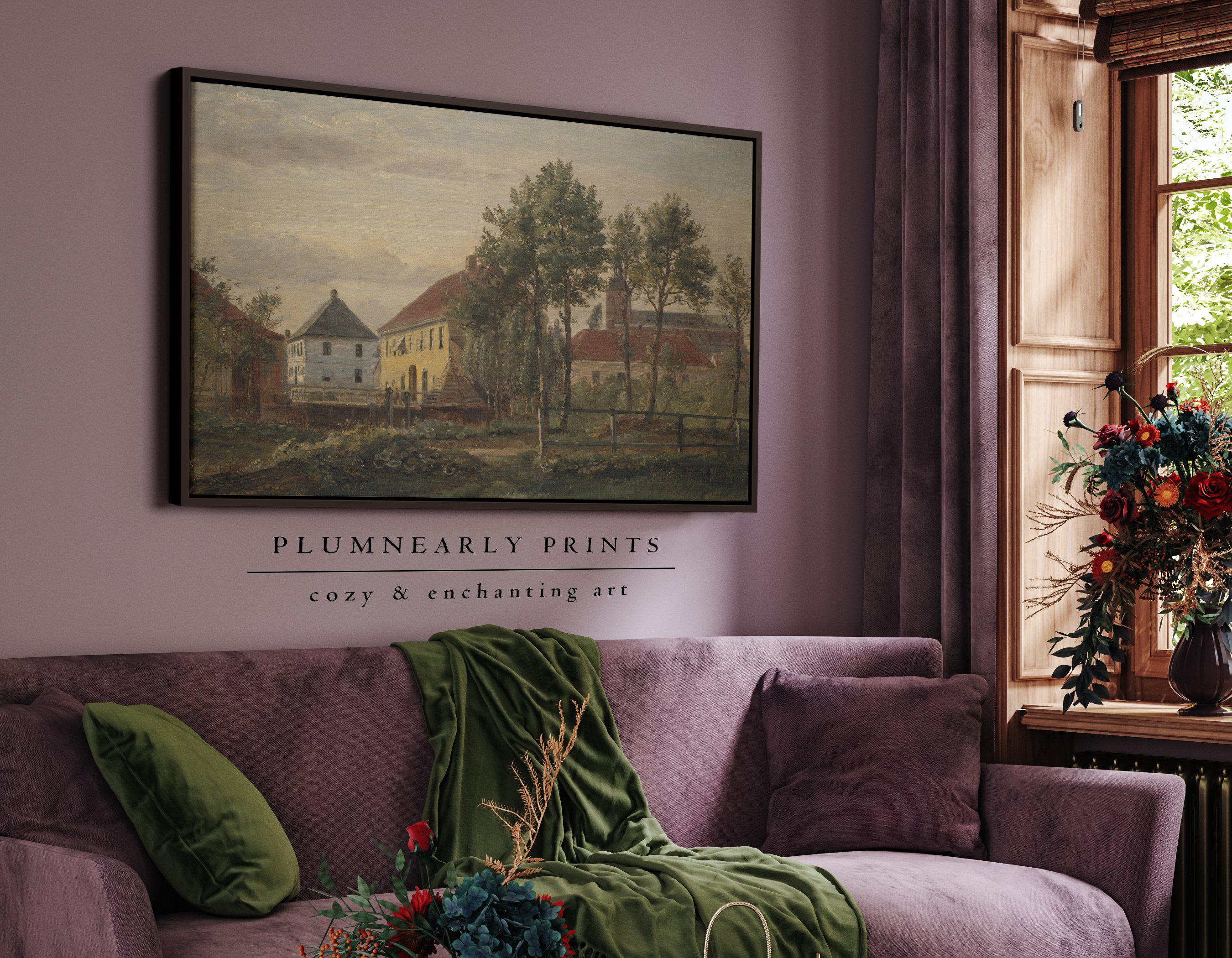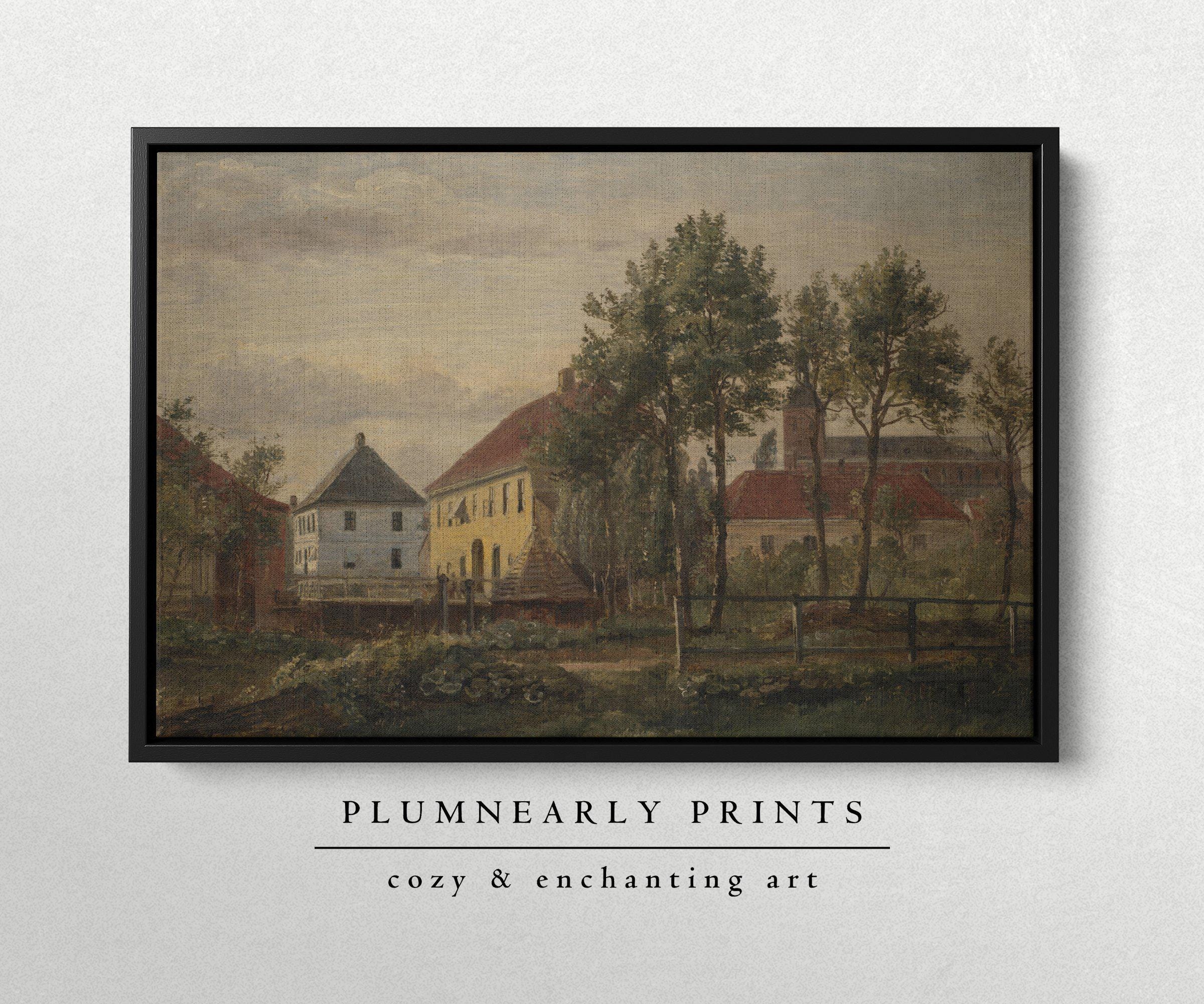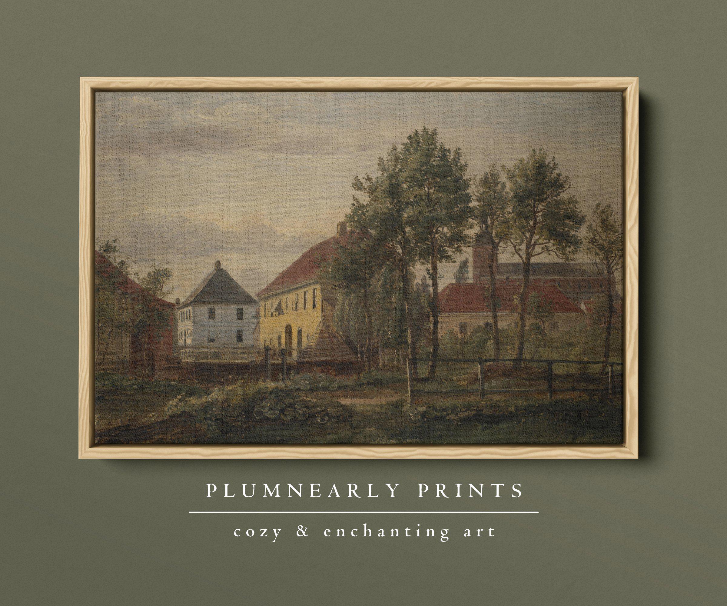 Discover the timeless beauty of this vintage antique landscape oil painting by 19th-century Danish artist Dankart Dreyer. Perfect for adding a touch of elegance to your home decor, this wall art piece captures a serene English countryside scene, featuring charming rustic farmhouse and romantic nature elements. The neutral tones of beige and sage green bring a calming ambiance, making it ideal for cottagecore enthusiasts and those seeking a French country aesthetic in their living space.