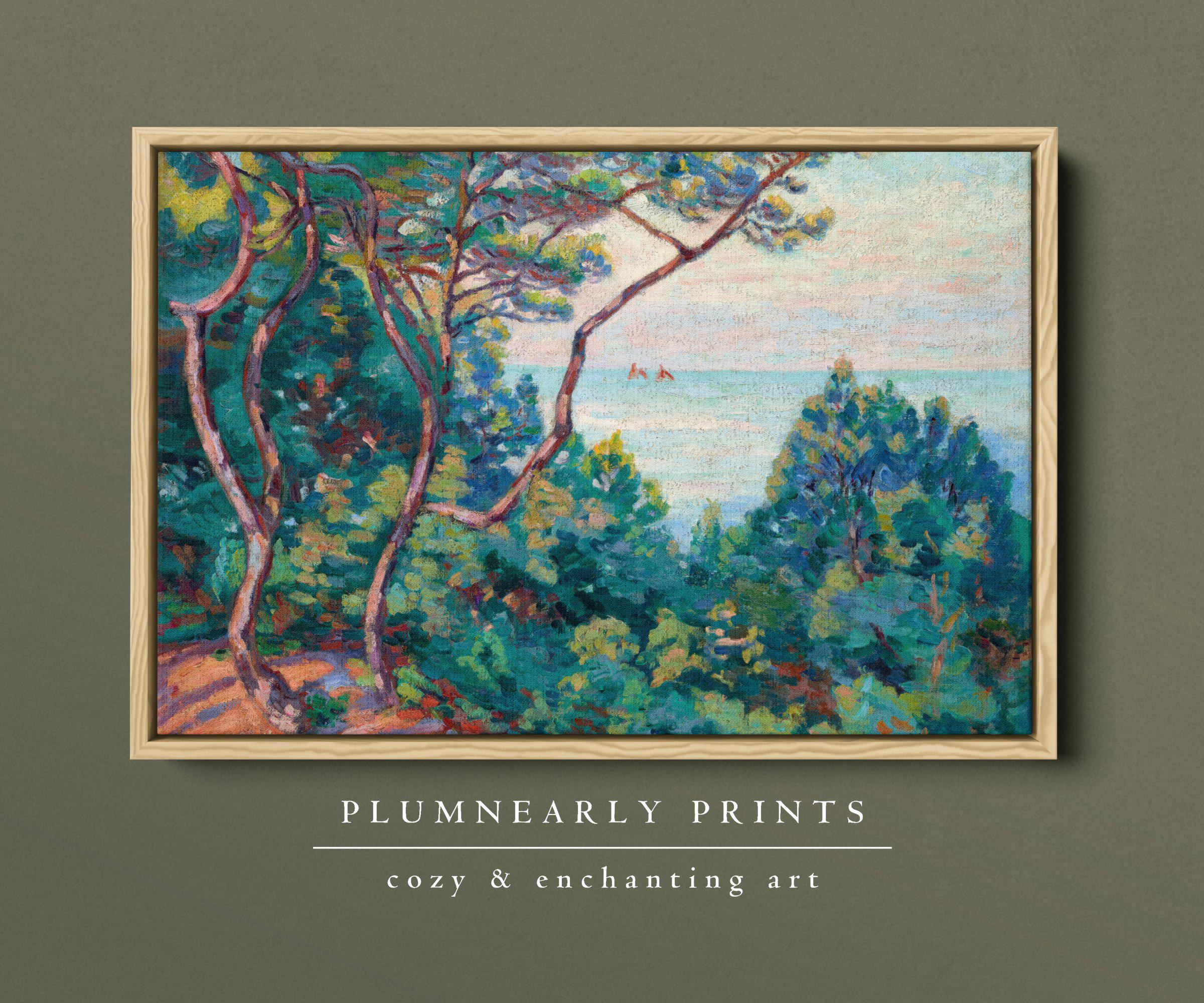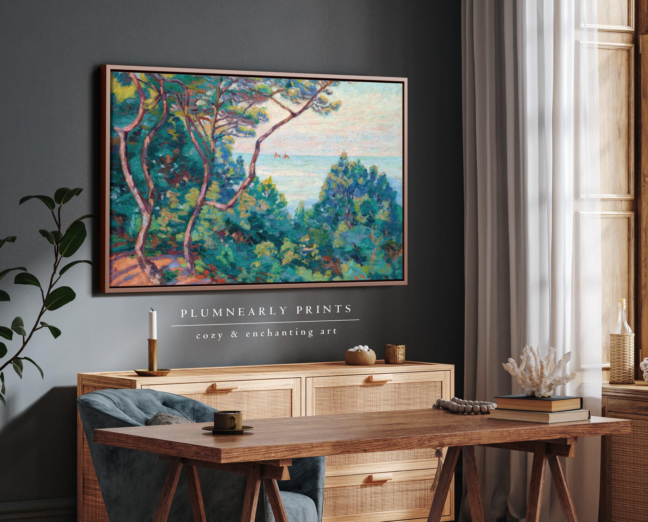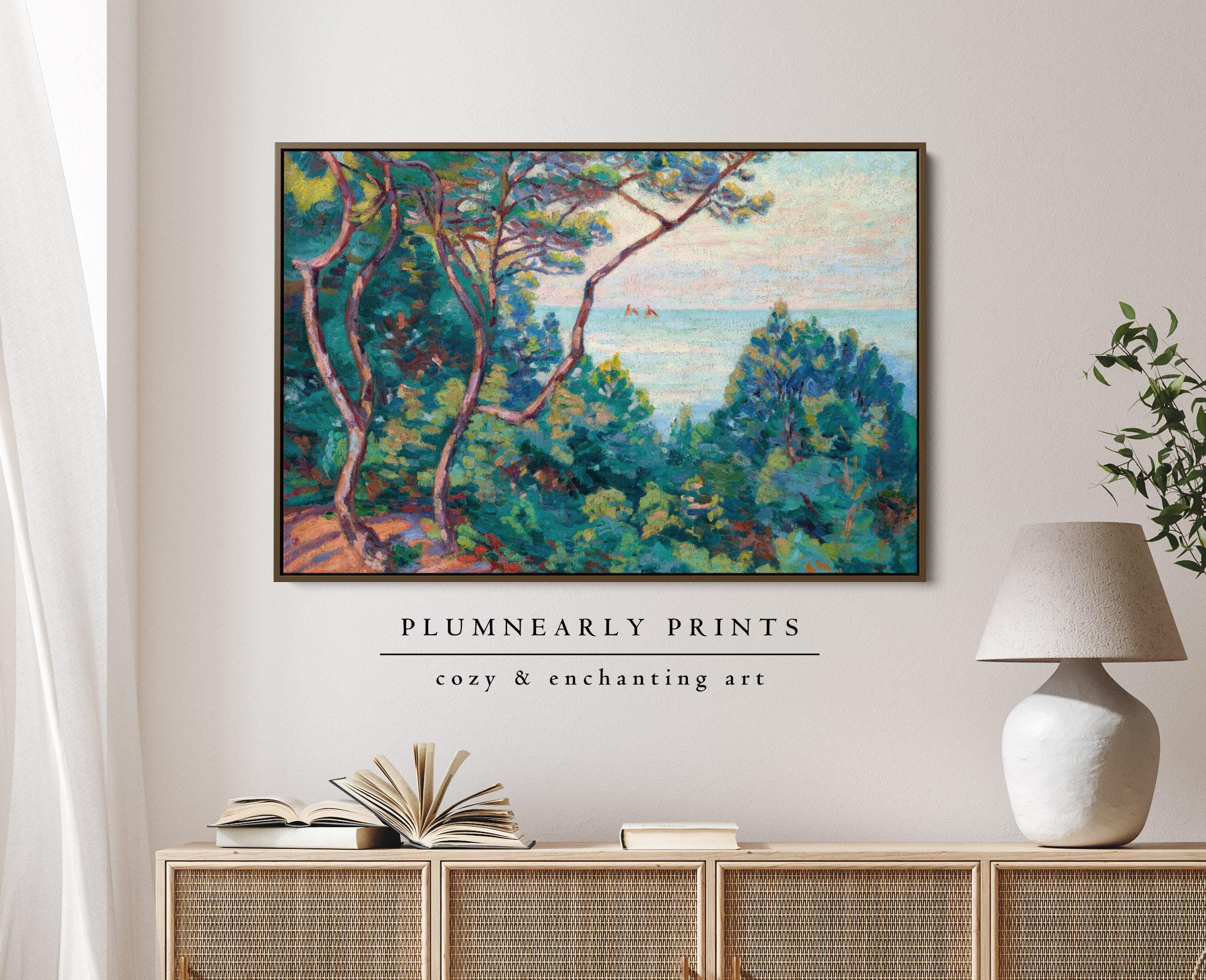 Guillaumin Coastal Cliff Landscape Painting Framed Canvas, Maximalist Chartreuse Forest Green Aquamarine Sea Blue Pastel Sunset Decor
