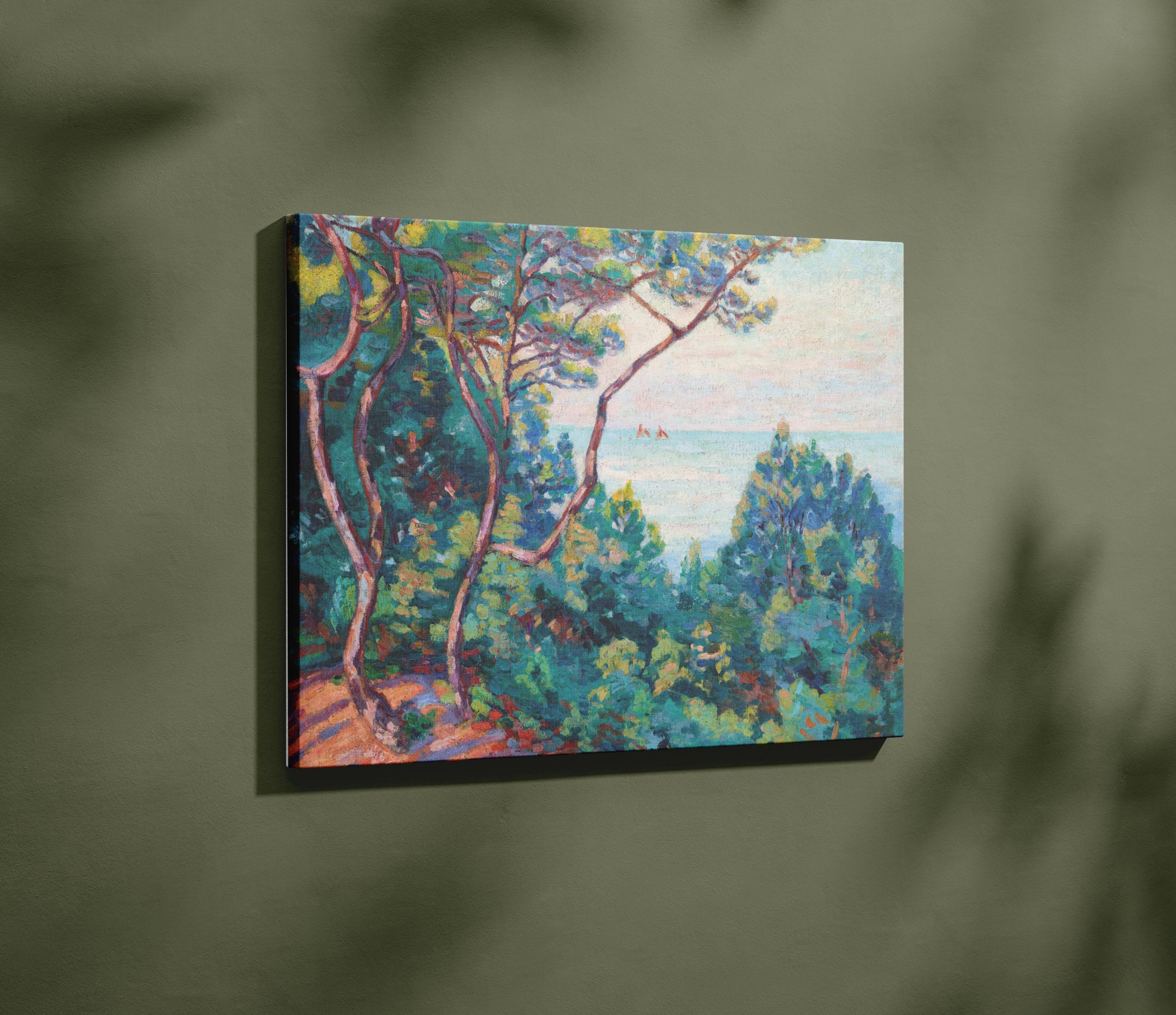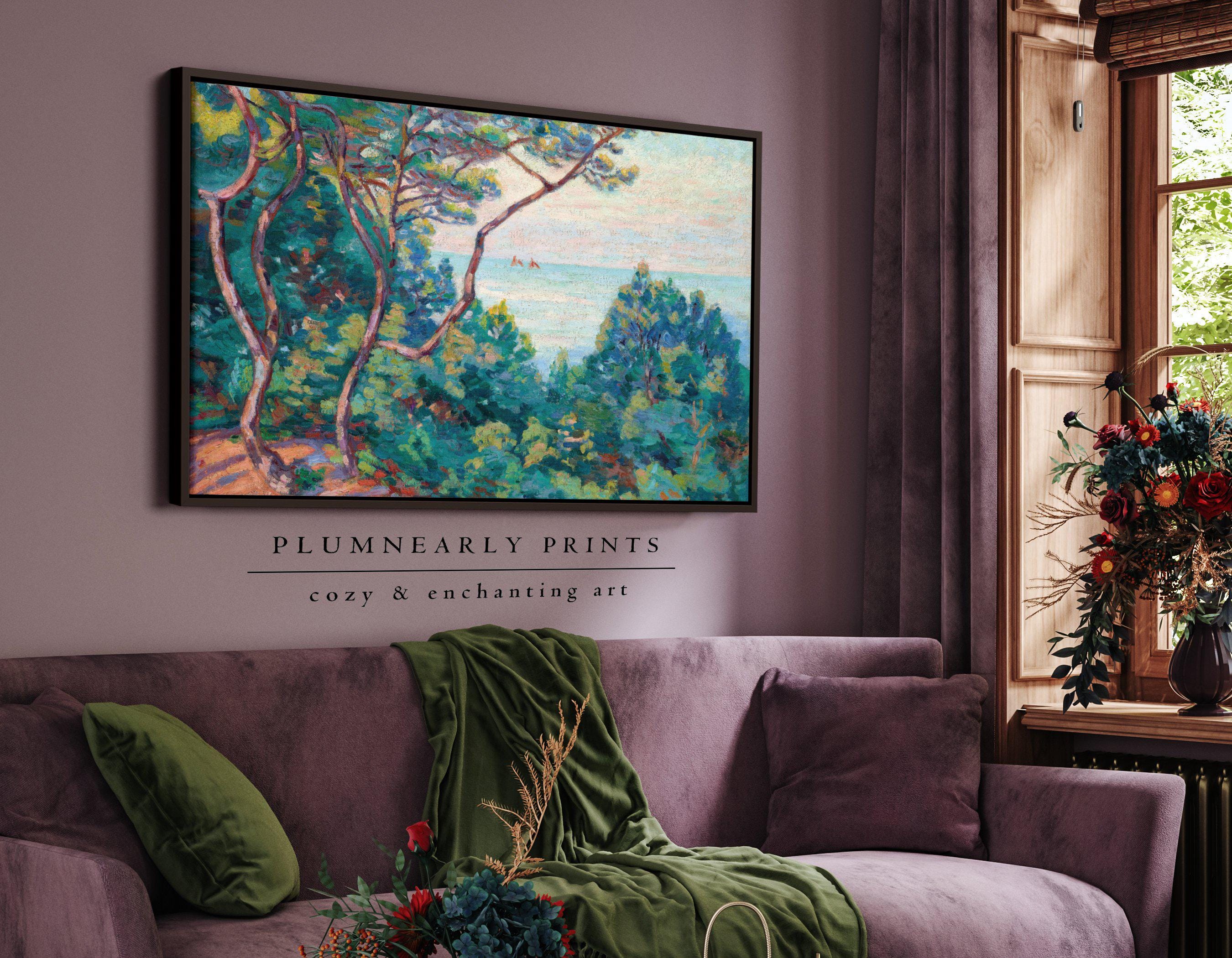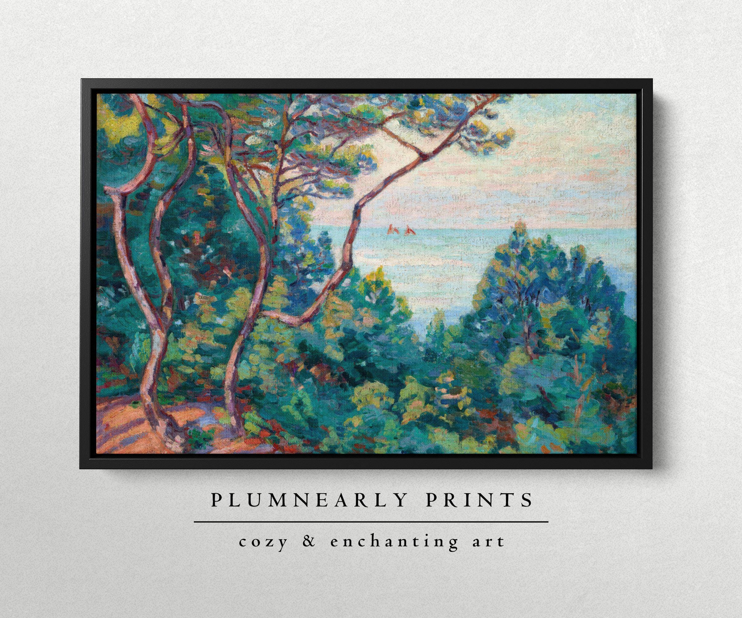 Guillaumin Coastal Cliff Landscape Painting Framed Canvas, Maximalist Chartreuse Forest Green Aquamarine Sea Blue Pastel Sunset Decor